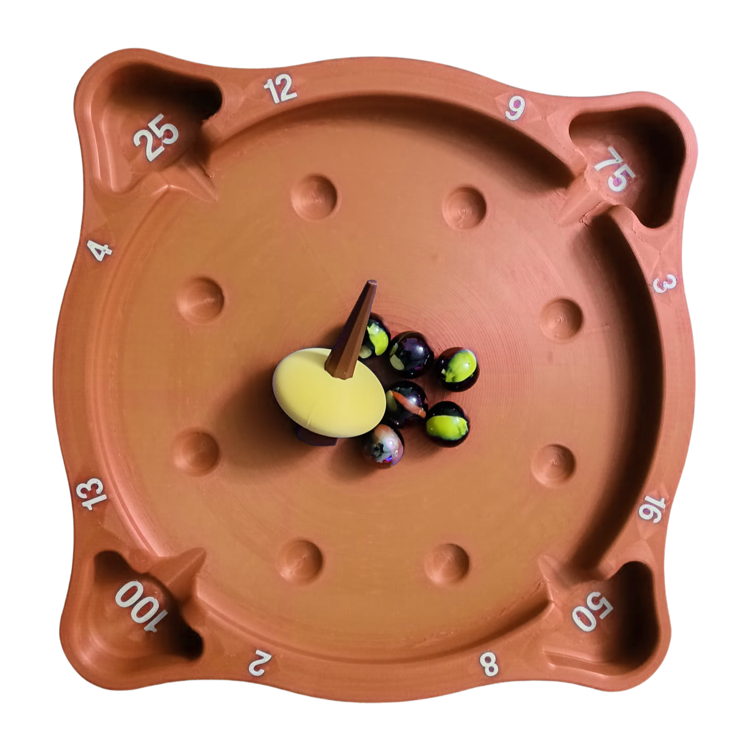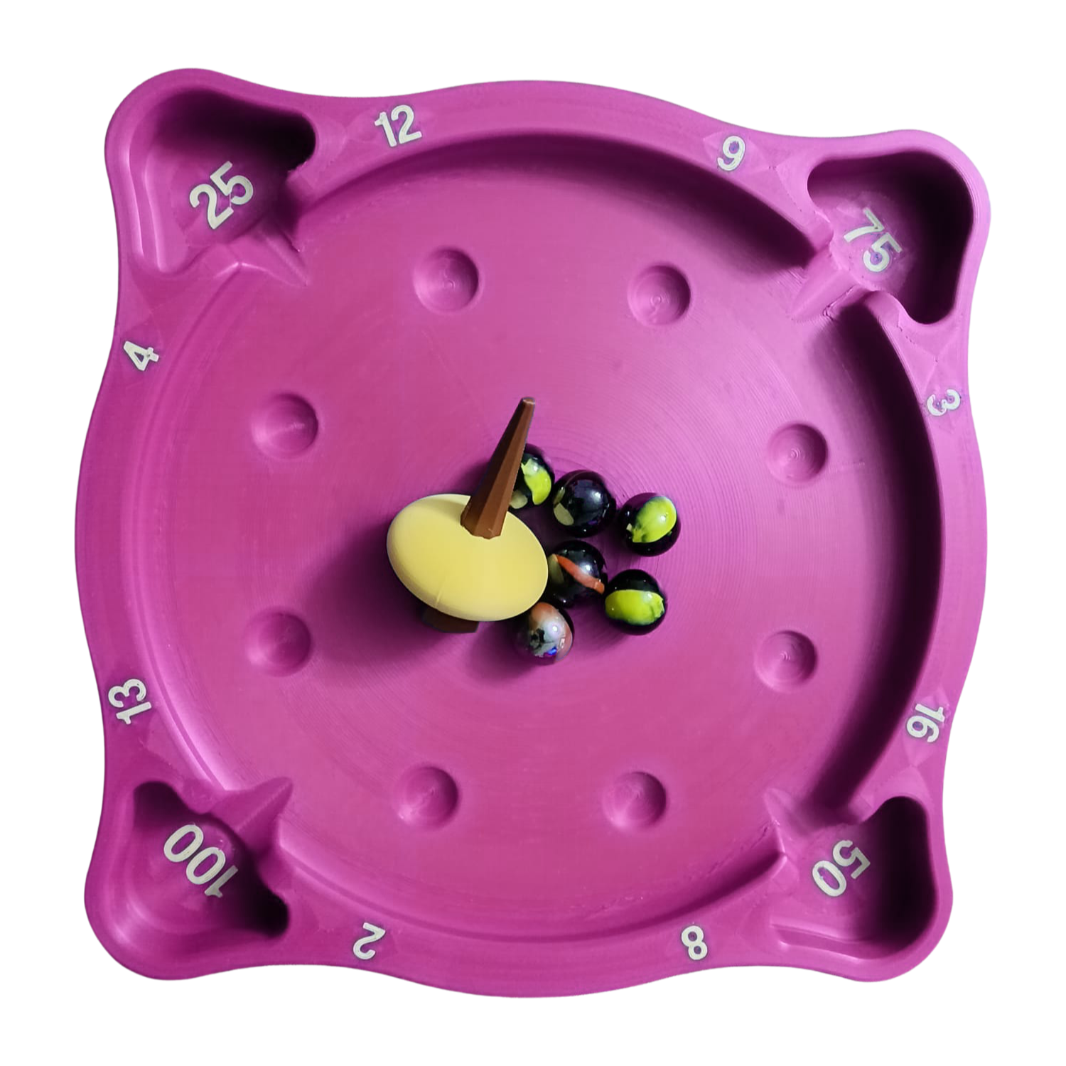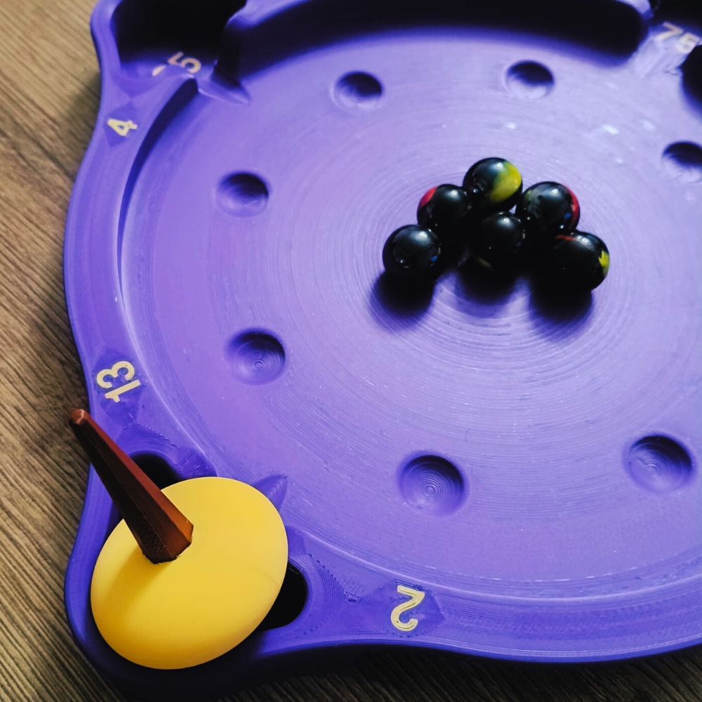 Topaç döndükçe bilyelere çarpar ve onları tablanın kenarlarındaki puanlı bölmelere (2,4,8, 12, 25, 50, 75, 100...) gönderir.