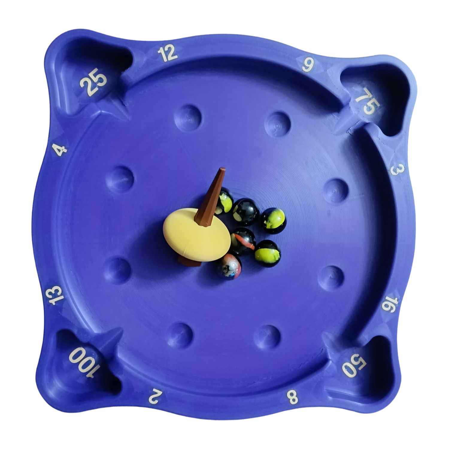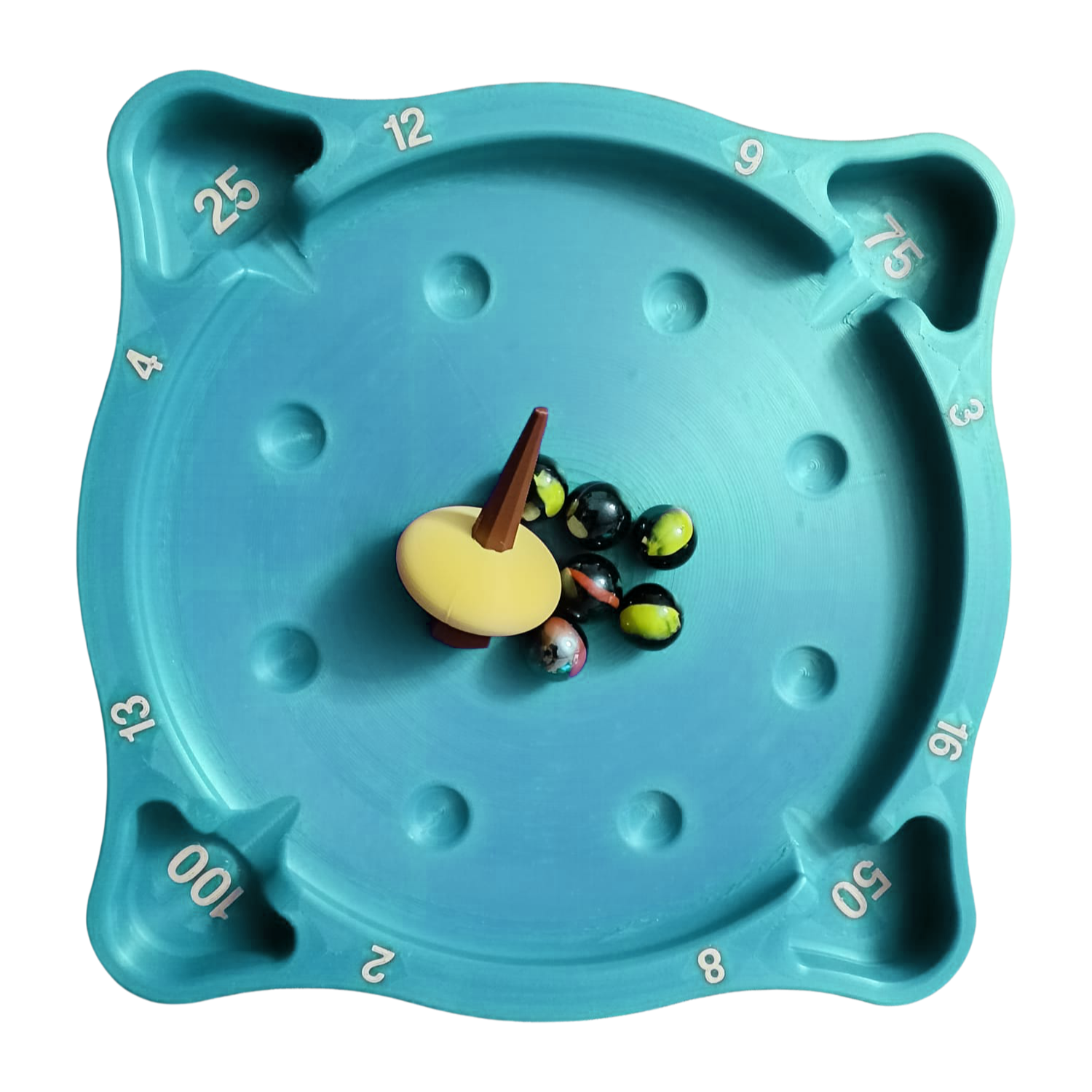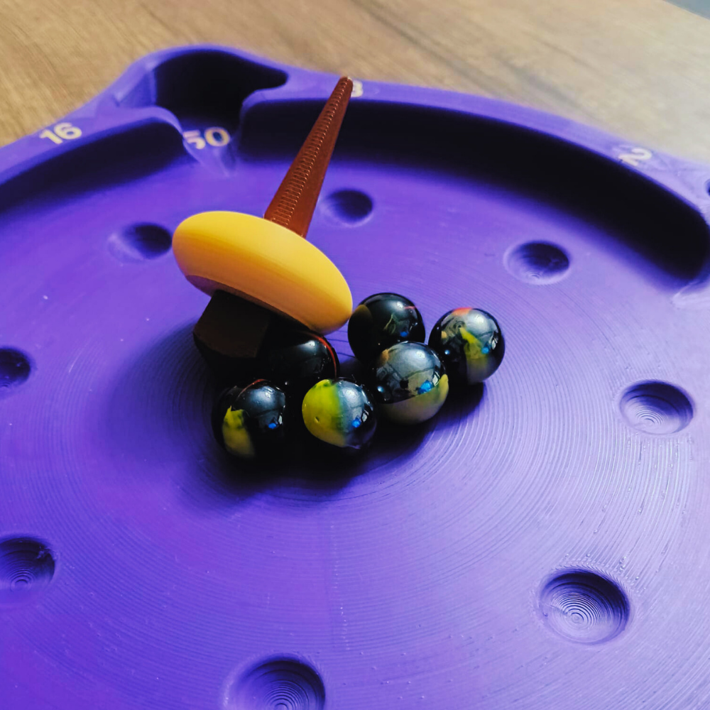 Topaç döndükçe bilyelere çarpar ve onları tablanın kenarlarındaki puanlı bölmelere (2,4,8, 12, 25, 50, 75, 100...) gönderir.